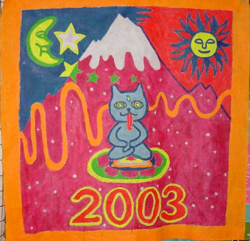 manas用バティック。布に蛍光油性顔料で着色。ブラックライト対応(2003)